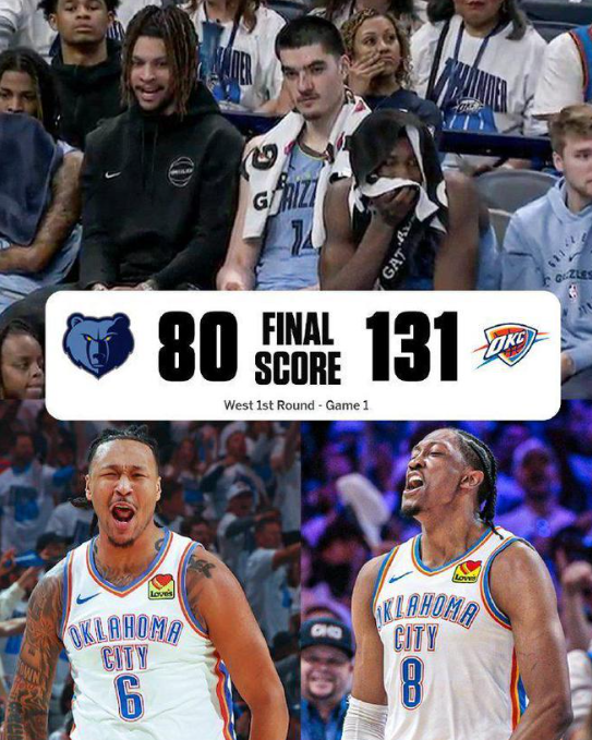 北京时间4月21日,NBA季后赛首轮G1雷霆主场对阵灰熊,雷霆借助6人得分上双的团队攻势,一边倒碾压灰熊最多领先56分优势,最终雷霆131-80狂胜灰熊51分狂刷纪录,雷霆总分1-0领先灰熊。